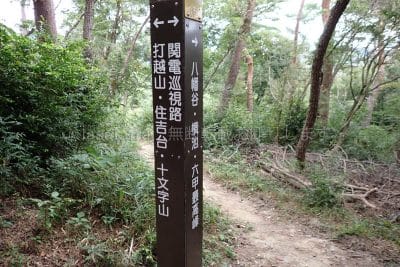金鳥山を過ぎてしばらく歩くと、右「風吹き岩1.0kmを経て六甲山山頂(尾根道)」、中央「風吹き岩1.0kmを経て六甲山山頂(谷道)」左「水平道を経て八幡谷・十文字山・住吉道」、手前方向「保久良神社1.0kmを経て阪急岡本」本日は左に行きます。