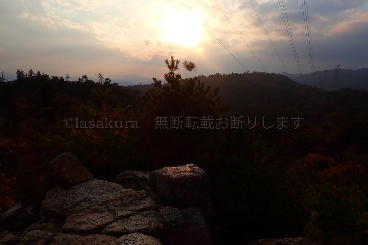 金鳥山付近でまで約20分。六甲山最高峰から足の裏の皮が全部剥けたかと思うほど痛く、麓まで登山道は無理だと判断し、保久良神社から車道(車両通行止)に出ました。道路がつづら折りになっており、木が少なく明るいのです。日没16:53の5分後に街灯のある天井川公園に到着しました。