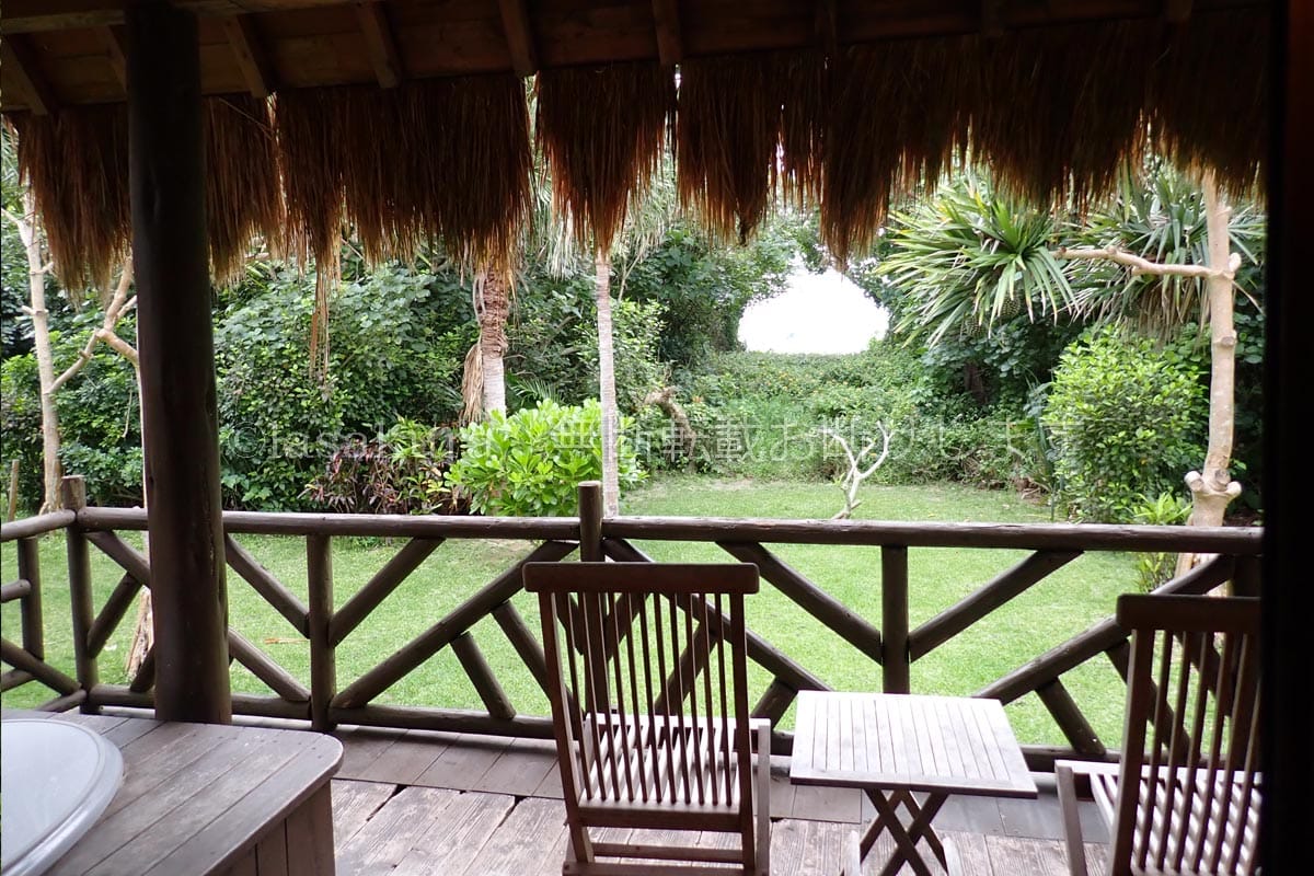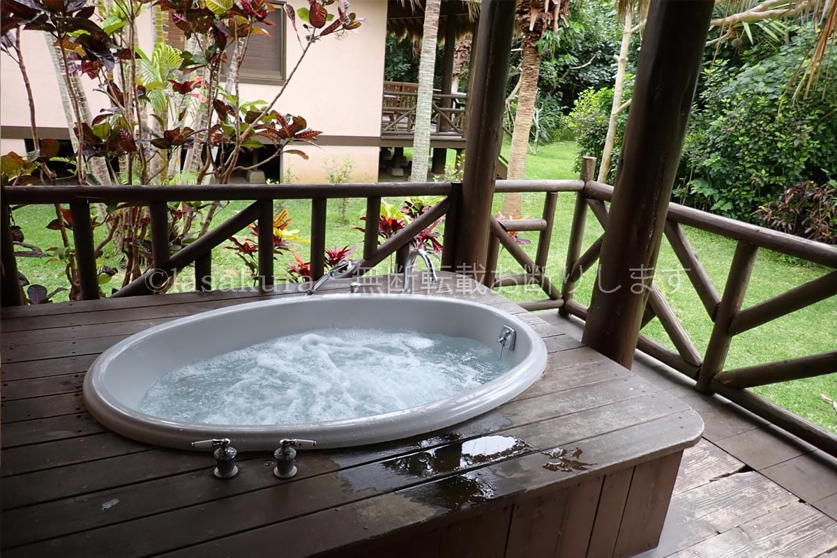 18㎡のバルコニーにはジェットバスがあります。南国の植物に囲まれたコテージのバルコニーから海を眺めながらジャグジーに入りたくて、このホテルに決めました。森のテラスをイメージして木に囲まれていますが、写真の通り、隣のコテージからは丸見えなので、水着が必要です。