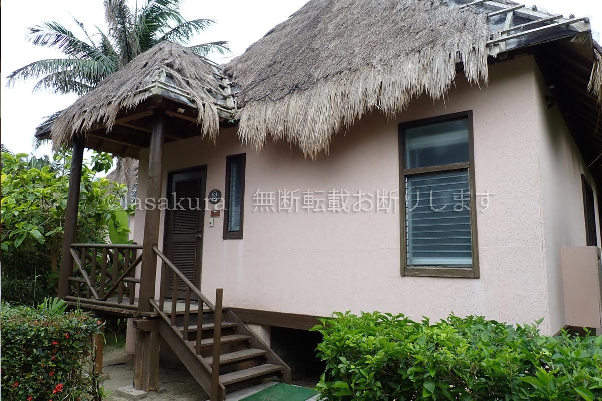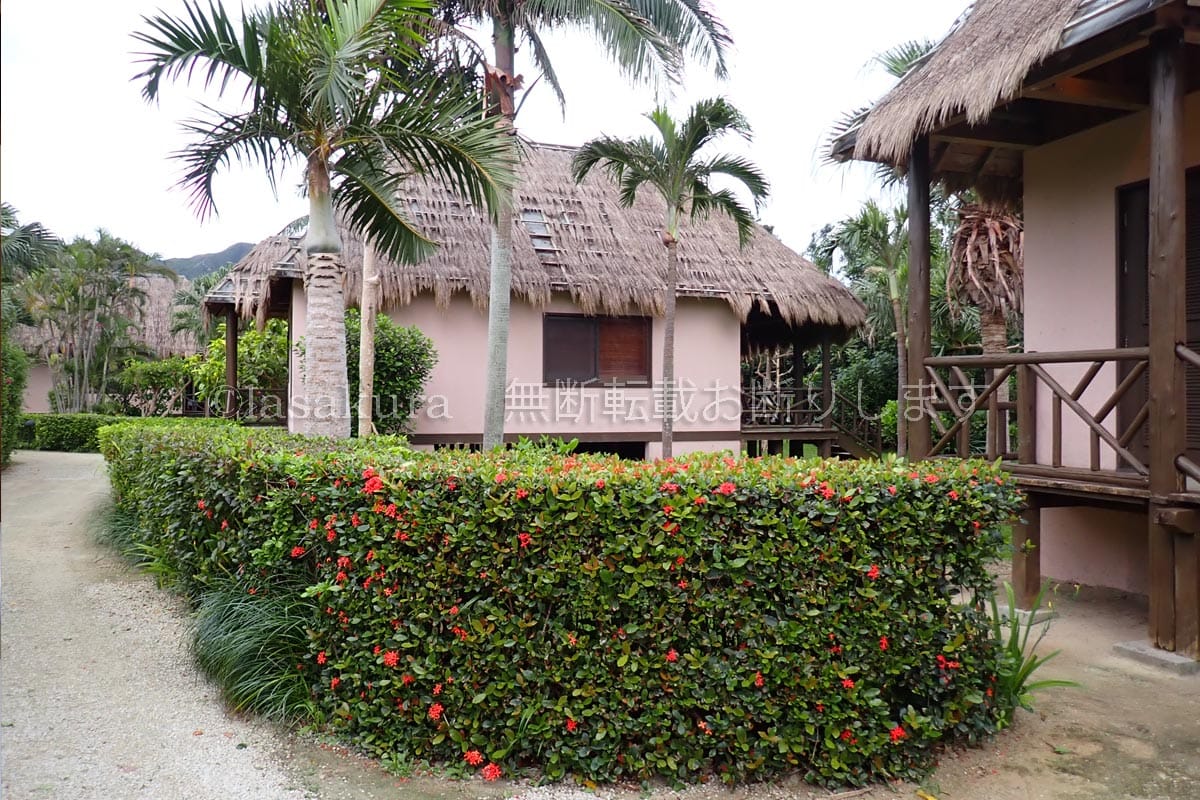 泊まるのは、ポリネシア風かやぶきビィラが並ぶ、石垣シーサイドホテルのかびらビレッジ。バルコニーまで合わせると65平方メートルもある一棟一室のコテージタイプのお部屋です。玄関は低い垣根で隣の棟と仕切られていました。